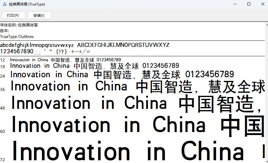 经典黑体简字体是一款非常经典的黑体简体字体。黑体字又称方体或等线体,其具有着没有衬线装饰、字形端庄、笔画横平竖直和笔迹全部一样粗细等特点。汉字的黑体是在现代印刷术传入东方后依据西文无衬线体中的黑体所创造的。由于汉字笔划多,小字黑体清晰度较差,所以一开始主要用于文章标题。但随著制字技术的精进,已有许多适用于正文的黑体字型。在中文中,没有衬线的字体通常称为黑体,这时这个词的范畴和无衬线字体(Sans-serif)是类似的。所以在中文字体中常用“黑体”,在西文中常用“无衬线体”的称呼。而宋体就可以被称作衬线字体。 “黑体”在日文中被称为Goshikku-tai(直译即“哥特体”)。