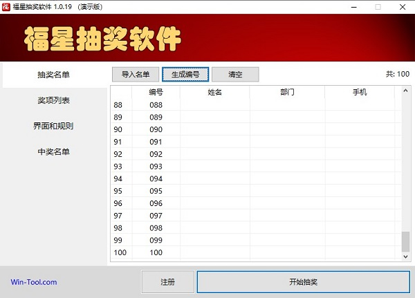 1、导入或生成抽奖名单您可以从Excel文件中导入抽奖名单,也可以按编号自动生成抽奖名单。在从Excel导入抽奖名单时,可以只导入抽奖界面上显示的信息,比如,如果是按手机号抽奖,则Excel中只提供一列手机就可以了。