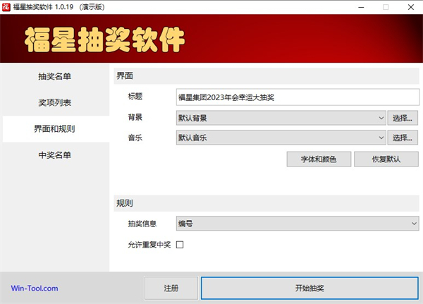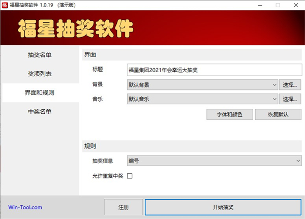 2 规则自定义。可以自定义背景和音乐;可以选择抽奖字段,如编号(工号)、姓名、部门、手机等;可以设置是否允许重复中奖。