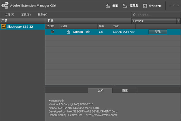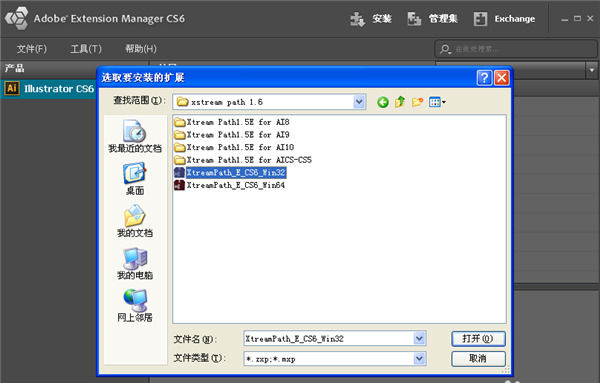 1、下载解压后,复制整个“XtreamPath2”文件夹(注意是整个文件夹,单独复制aip文件是不行的)到X:\Adobe Illustrator CC\Plug-ins(在某些版本下可能显示为增效工具)文件夹下即可。以CS6为例,打开Adobe Extension Manager CS6。