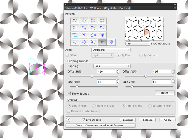 动态壁纸用指定区域填充所选艺术作品的副本。Xtream Path 2面板根据国际晶体学联合会(IUC)标准提供17种不同的壁纸图案。壁纸中的单位可以转移到Illustrator的“图案编辑模式”并保存在“样本”面板中。
