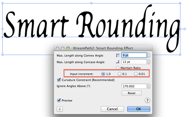Smart Rounding可以单独设置凸角和凹角,也可以设置最大长度。(有“沿凹面角度的最大长度”和“沿凸角的最大长度”的设置。)此外,即使有大量文本,它也可以在眨眼间作为批处理进行处理。智能舍入是圆润文本角落的最佳工具。
