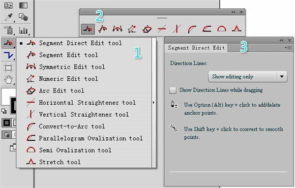 Xtream Path 2是一款使用方便的AI插件,它将路径编辑变得十分简单。熟练使用此插件,能够有效地提升工作效率。本文主要讲解Xtream Path插件中“直线线段编辑工具”的使用。1、我们先来熟悉一下界面。在AI工具箱区域,鼠标点住“直线线段编辑工具”的图标2秒钟以上,出现1号面板上面列有该工具下的11个子工具。鼠标点击1号面板右侧的三角箭头,弹出2号面板,这是11个子工具的面板,可以直接点选使用。鼠标点击2号面板中的任意一个工具,弹出3号面板,这是对应该工具的参数面板。这个工具面板,可能含有参数,也可能仅仅是该工具的介绍。