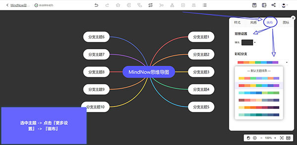 选中主题,点击右上角的『更多设置』按钮,在『样式』-『画布』中可以选择设置彩虹分支