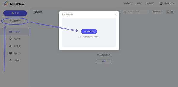进入MindNow官网首页(www.mindnow.cn),登录后点击『进入我的文件』,在个人文件页面的左上角点击『新建』按钮,选择自己需要的结构。