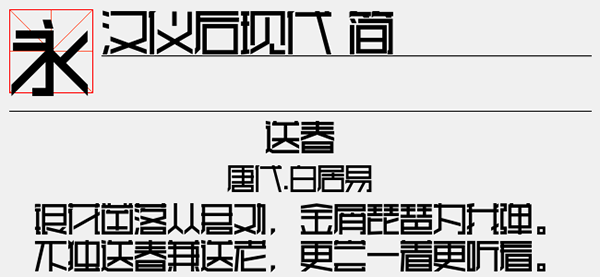 汉仪后现代字体是款不错的艺术字体,由汉仪字库官方出品,其字体方方正正,都拥有着一样的大小,看起来就十分的整洁,同时呢字体的角度、大小、距离都设计得非常恰当,整体效果极佳,并且中英文、阿拉伯数字全面支持,可以很好的应用于文本装潢、信息展示、网页设计、篆刻制模、数据制作、装潢设计、计算艺术设计、视觉设计、字帖等一切合法应用场景,有喜欢的朋友可免费下载收藏。