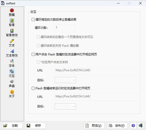 3、交互界面包括“循环指定的次数后停止剪辑动画”“用户点击flash剪辑时在浏览器中打开相应网页”“flash剪辑结束运行时在浏览器中打开网页”等几个选择设置。