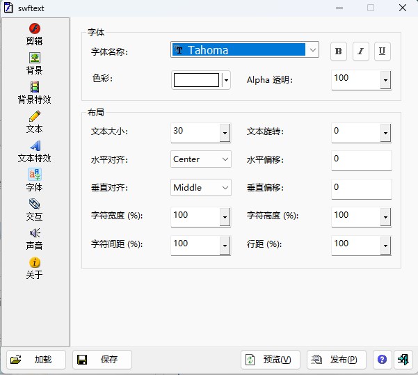 swftext汉化版是一款小巧实用的文字动画特效的工具,该工具包含“森林”“闪亮”“水滴”“下雨”等40种背景图案,以及包括“爆炸”“彩虹”“城堡”“弹簧”等160多种的文字效果,大量的素材供你选择,用户可以创建出所需要的背景图案和文字特效,制作出自己想要的文字动画风格,swftext汉化版操作清晰,操作简单,每一步都有引导提示,就算新手也很容易上手,有喜欢文字动画的朋友可以下载使用,DIY出独特风格文字!不过可能是由于汉化原因,使用汉化版导出的文件会出现不清晰的现象,经过小编试验可以先导出SWF格式,然后再用其它格式转换器转换格式就不会出现这个问题了。