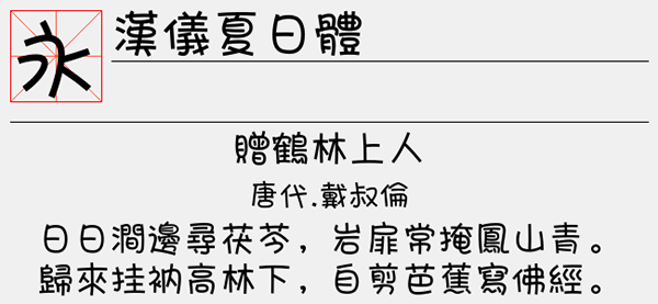 汉仪夏日体繁是一款百看不厌、赏心悦目的中文字体,字体字型端正整洁,用笔流畅自然,字形也是非常的整齐。采用了传统的楷书形式展示,可谓大家呈现一种严谨而不失风范的既视感,适应于报纸和杂志和书籍中常用字体海报、个性促进品牌标志设计、字体设计、文本装潢、信息展示、篆刻制模英文、数据制作、装潢设计、视觉设计、字帖等一切合法应用场景,有喜欢的朋友可免费下载收藏。