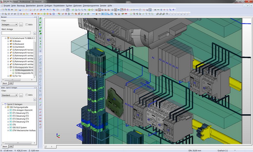 更灵活的三维导体布线:现在,电缆以及导体可以通过一个3D安装布局来布线。性能的新标准也适用于电缆布线:它可以非常直观地限定网络路线并铺设连接,还可以独立完成真实的或虚拟的电线槽。新的布局领域进一步扩大了3D布线的可能性,并支持Lütze框架体系的虚拟布线。可以使用“接线孔”对电线或电缆进行布线,例如,沿最短路线在安装板背面、隔板或其他外壳部分布线。