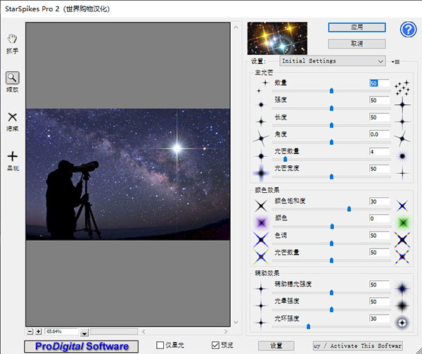 5、打开Starspikes pro2插件就可以立即使用,在界面的右边可以调节各类参数(具体使用教程见下方),以实现实际的效果需要