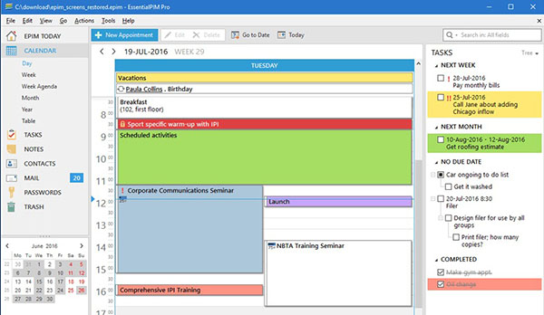 EssentialPIM电脑版是一款非常杰出的个人信息管理和工作手册软件。软件界面直观,功能十分丰富,能够很好的帮助用户管理个人信息,以电子化的形式保存,包括您所有的日程、任务、记事、通讯录、登陆密码都可以保存在图形化界面中,同时软件还能够对事件进行多种分类,让事件于行事历中的显示更加清楚,能够在多台设备之间管理会议、任务、备忘录、通讯录、密码和电子邮件、并同步到云服务,非常实用方便。