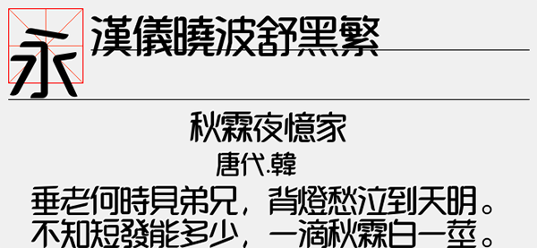汉仪晓波舒黑繁是汉仪字库开发的一款创意字体,该字体本身字骨偏硬,横竖撇捺均为直线,并且尝试在笔画细节上以圆角修饰。字体笔锋圆润的设计能够带给用户更多柔和感,简约的丰富充满现代时尚气息,字体使用合理能够更好的展现出你想要表达的特色。可以应用于文本装潢、信息展示、网页设计、篆刻制模、数据制作、装潢设计、计算艺术设计、视觉设计、字帖等一切合法应用场景,有喜欢的朋友可免费下载收藏。