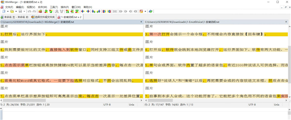 1、支持文件(Windows,Unix和Mac文本文件格式)及文件夹的比较; 2、对文本文档的可视化编辑以及合并; 3、灵活的编辑器,支持语法高亮、显示行号和自动换行,差异窗口显示; 4、在文件比较中检测移动过的段落; 5、基于正则表达式的文件过滤器,允许排除和包含项目; 6、支持比较文件夹内所有子文件夹; 7、以树状形式显示文件夹比较结果; 8、支持Windows 7 X64位系统; 9、将两个文件内容做对比,并在相异之处以高亮度的方式显示,让使用者可以很快的查知; 10、可以直接让左方的文件内容直接覆盖至右方,或者反过来也可,这对需要常常修改文件内容的朋友来说,会是相当便利的一个功能。WinMerge使用方法