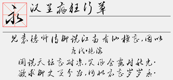 汉呈疯狂行草字体是由汉呈字库打造的一款介于行书、草书之间的书体,该书体就是为了弥补楷书的刻板和草书的难于辨认而产生的,具有很好的视觉感,且字库完整,可以很好的应用于文本装潢、信息展示、网页设计、篆刻制模、数据制作、装潢设计、计算艺术设计、视觉设计、字帖等一切合法应用场景,有喜欢的朋友可免费下载收藏。